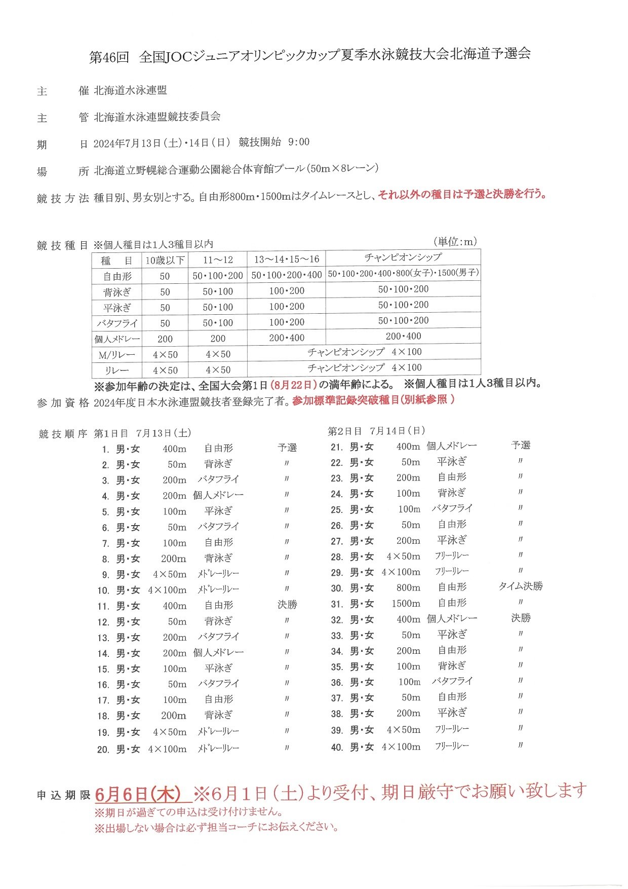 2024年度 全国JOCジュニアオリンピックカップ夏季水泳競技大会北海道予選会のお知らせ!