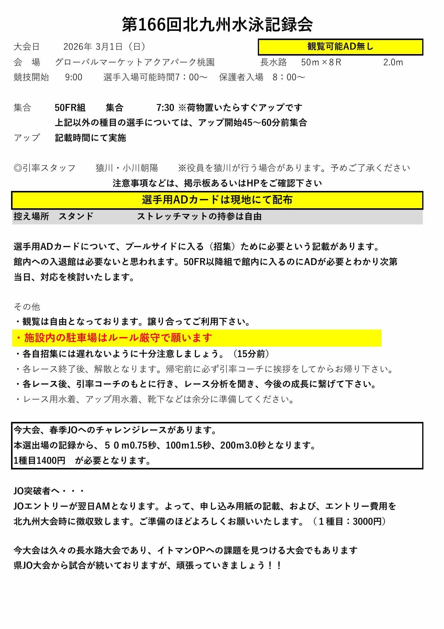 3/1(日)に行われる「北九州水泳記録会」の注意事項です